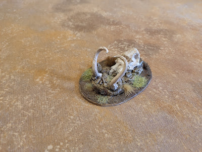 Hace ya un par de años vi esta entrada en ¡Cargad! y me resultó una idea bastante interesante de cara a fabricar escenografía barata. Y algo más tarde vi esta otra en La Vieja Guardia, lo que me terminó de convencer de que tenía que hacerme mi propio cementerio de mamuts/elefantes/lo que fuera (así que gran parte del crédito va para ellos). Por otra parte llevaba ya una temporada rumiando la idea de fabricar algún elemento que en el tablero contara como terreno difícil pero sin ser el típico bosque, lago o pantano, sino algo más tirando a un roquedal o similar. Pero una acumulación de huesos gigantes siempre es más interesante que una acumulación de piedras, así que aquí está el resultado.